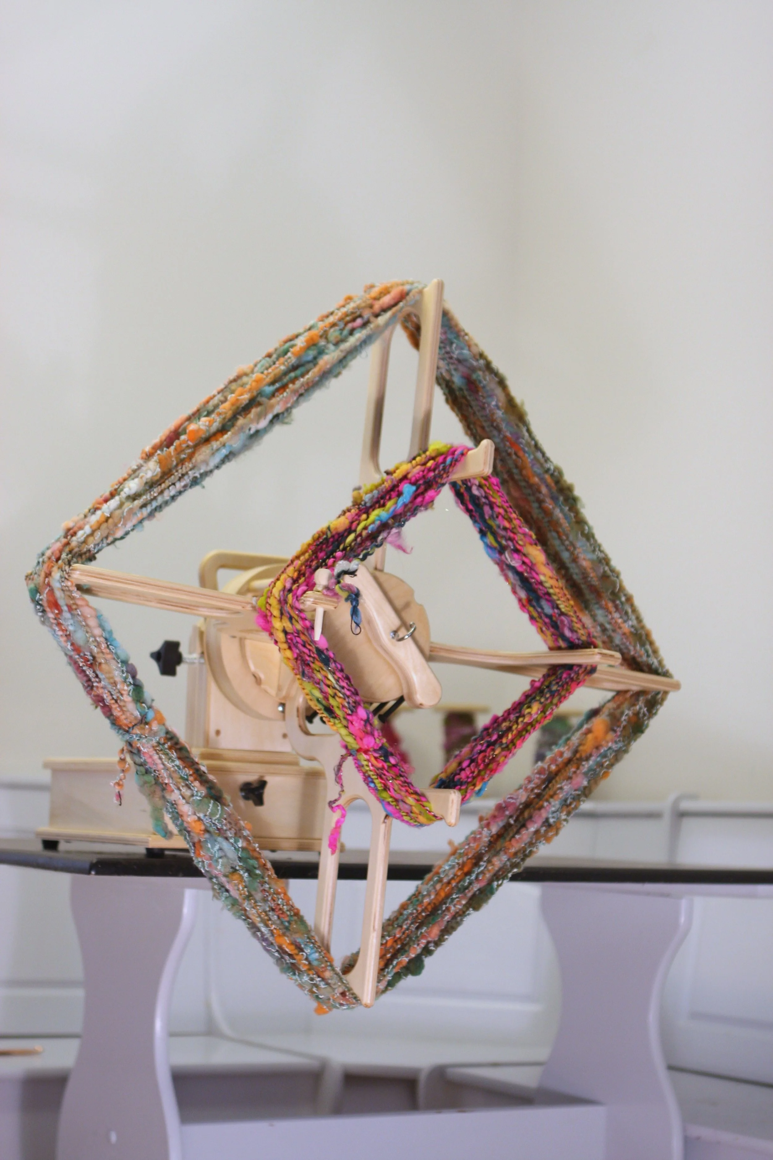 The SpinOlution Skein Winder is a versatile tool designed to wind both 1-yard and 2-yard skeins and mounts directly onto the 8 oz, 16 oz, and 32 oz flyer heads just like a bobbin. In addition to yarn winding, some fiber artists also use the skein winder to hold warp for looms during sectional warping, adding even more studio flexibility.
