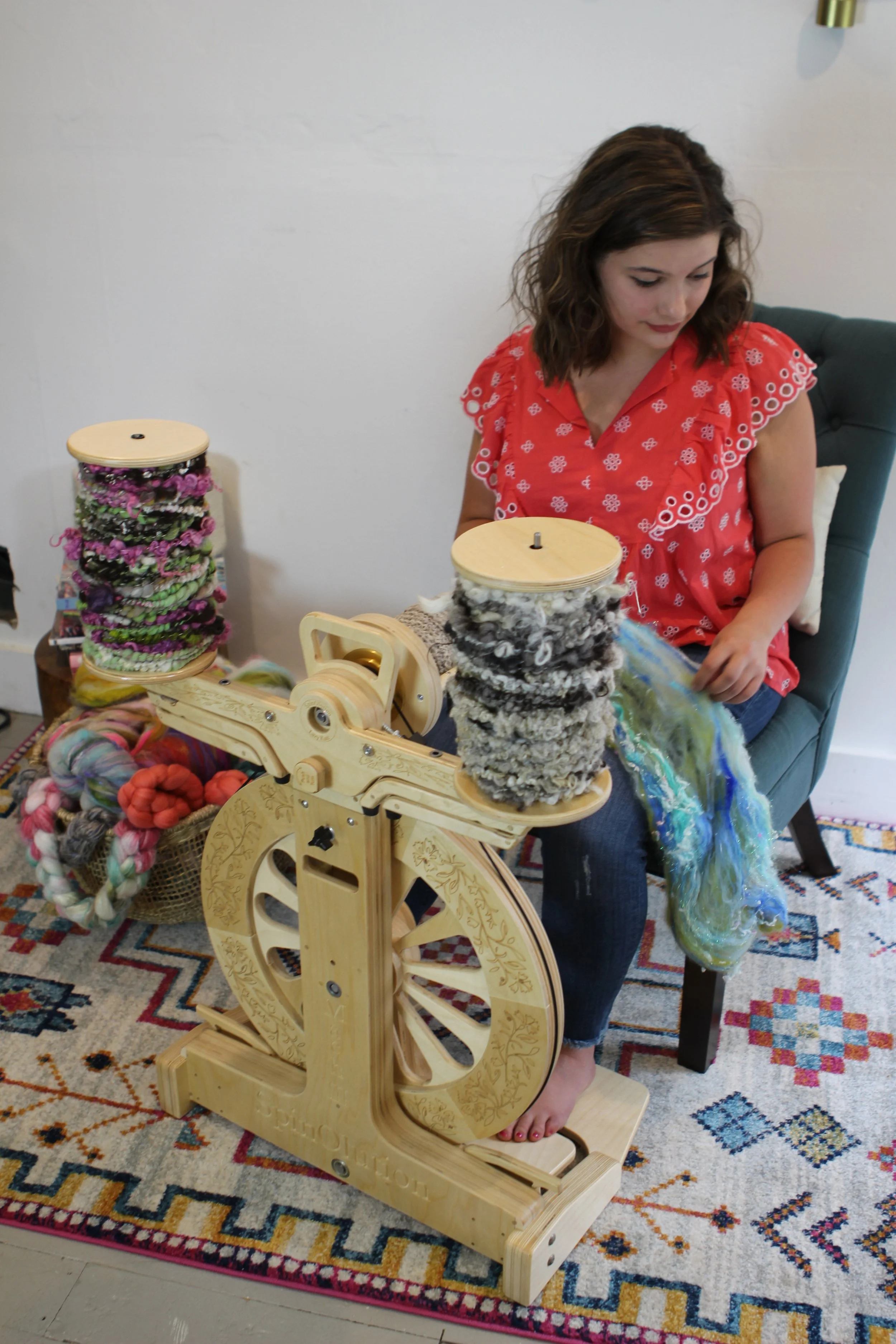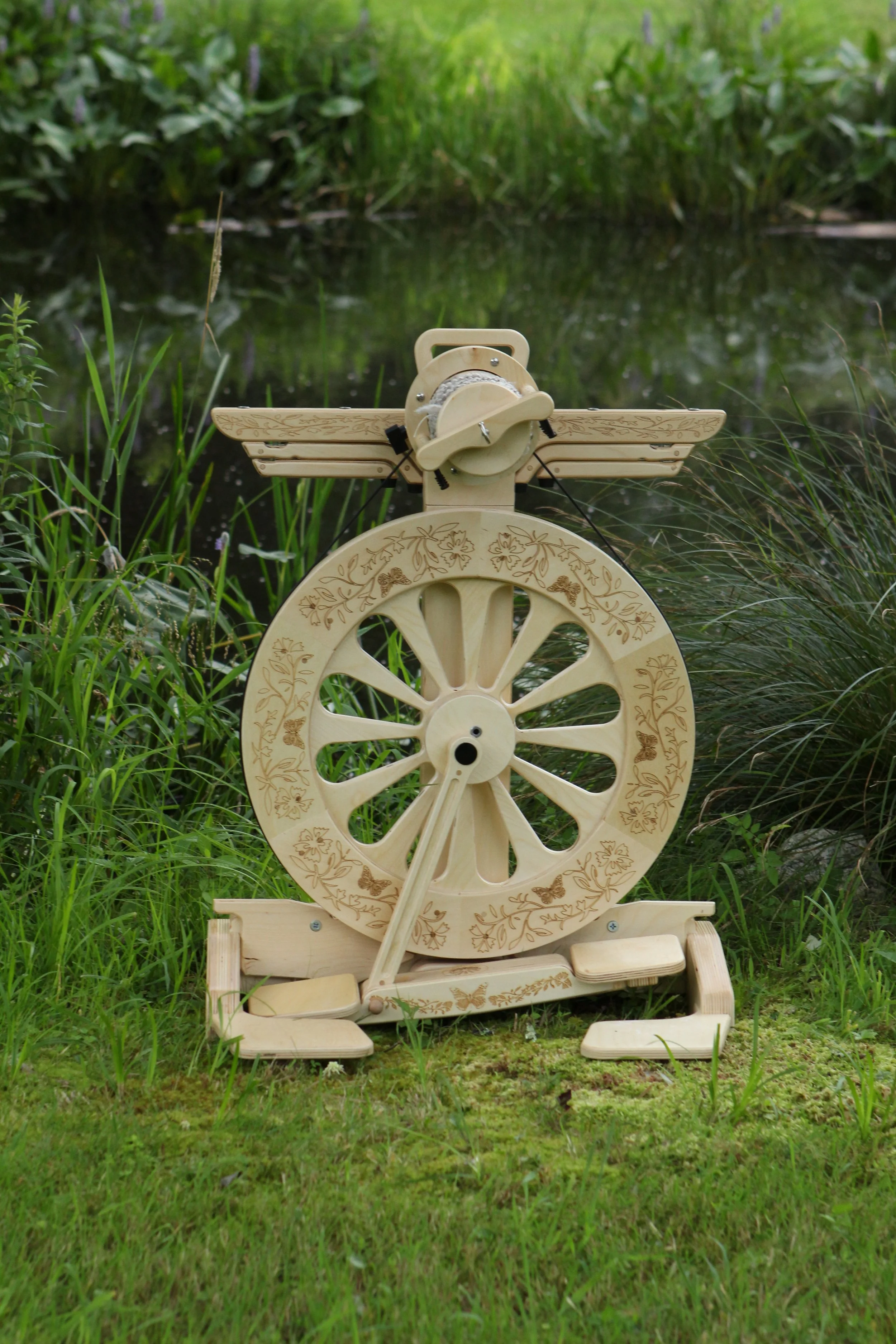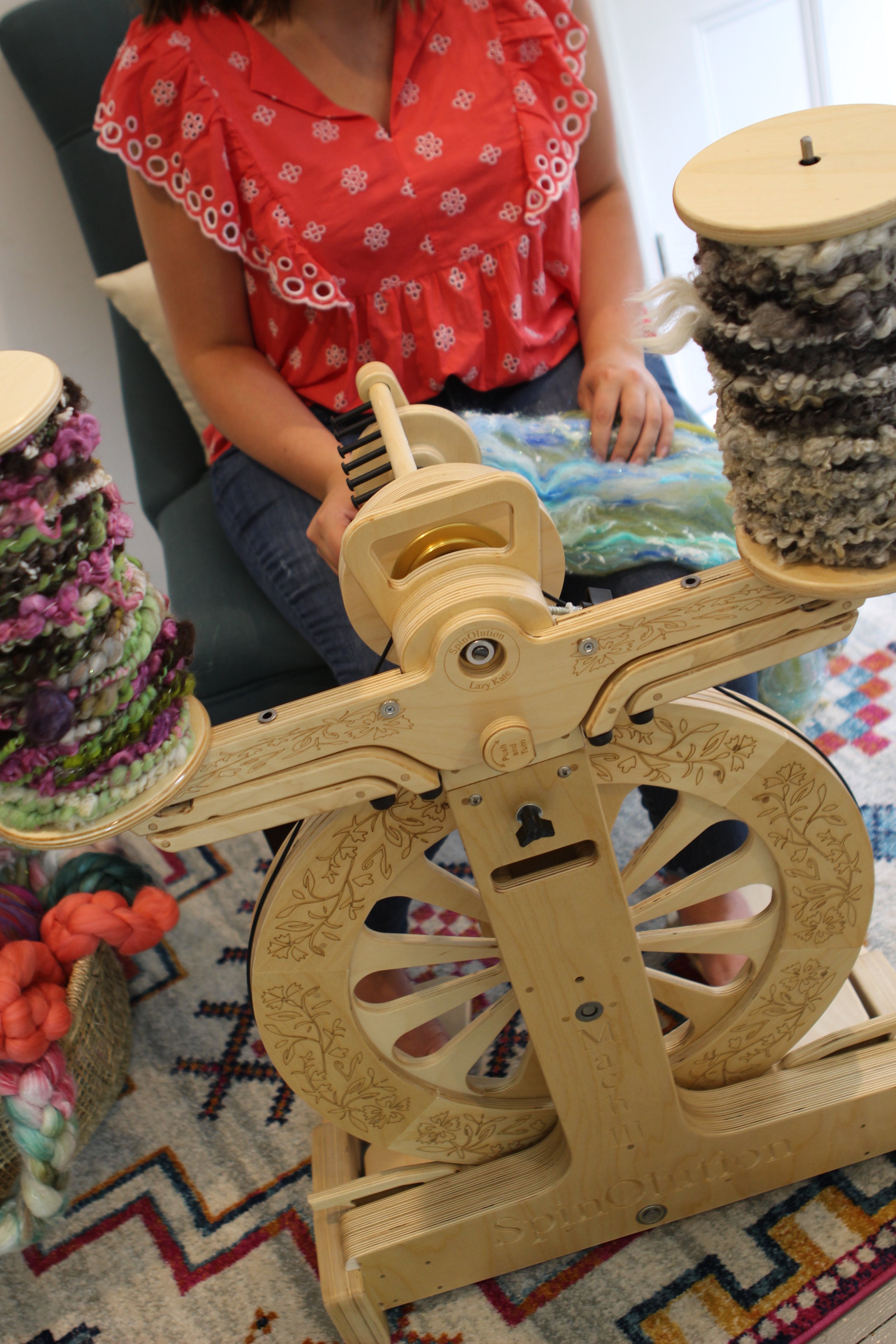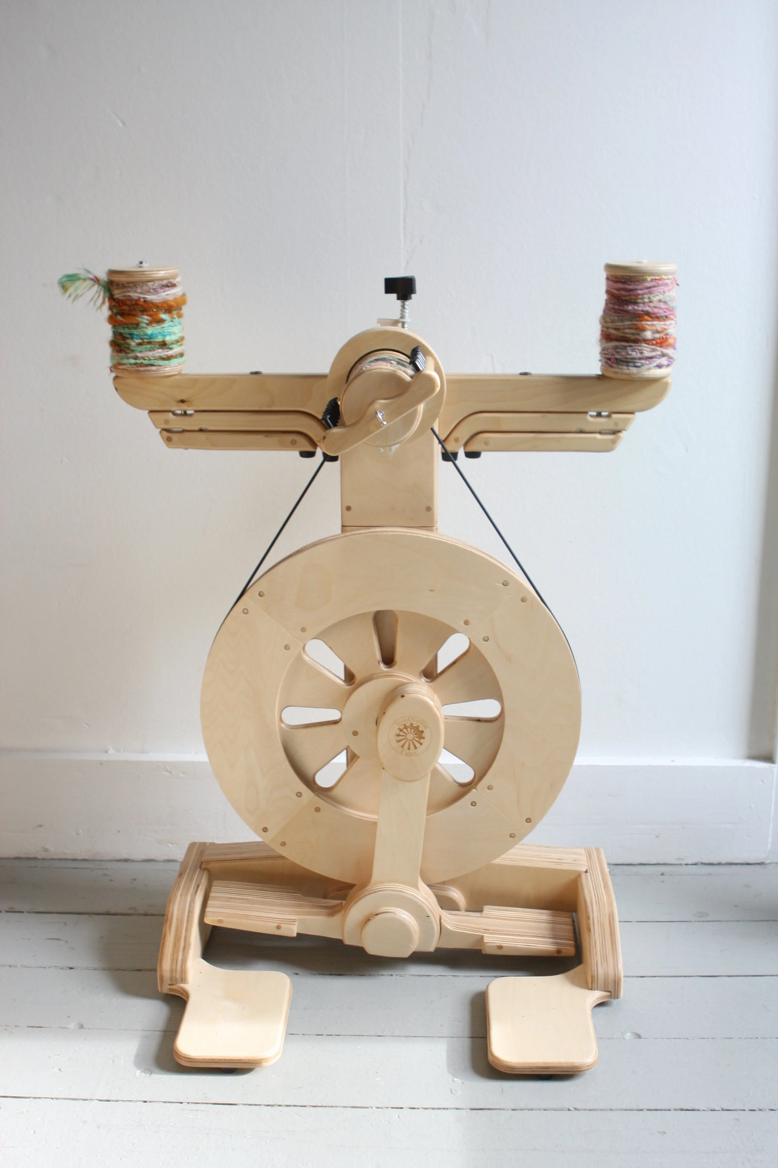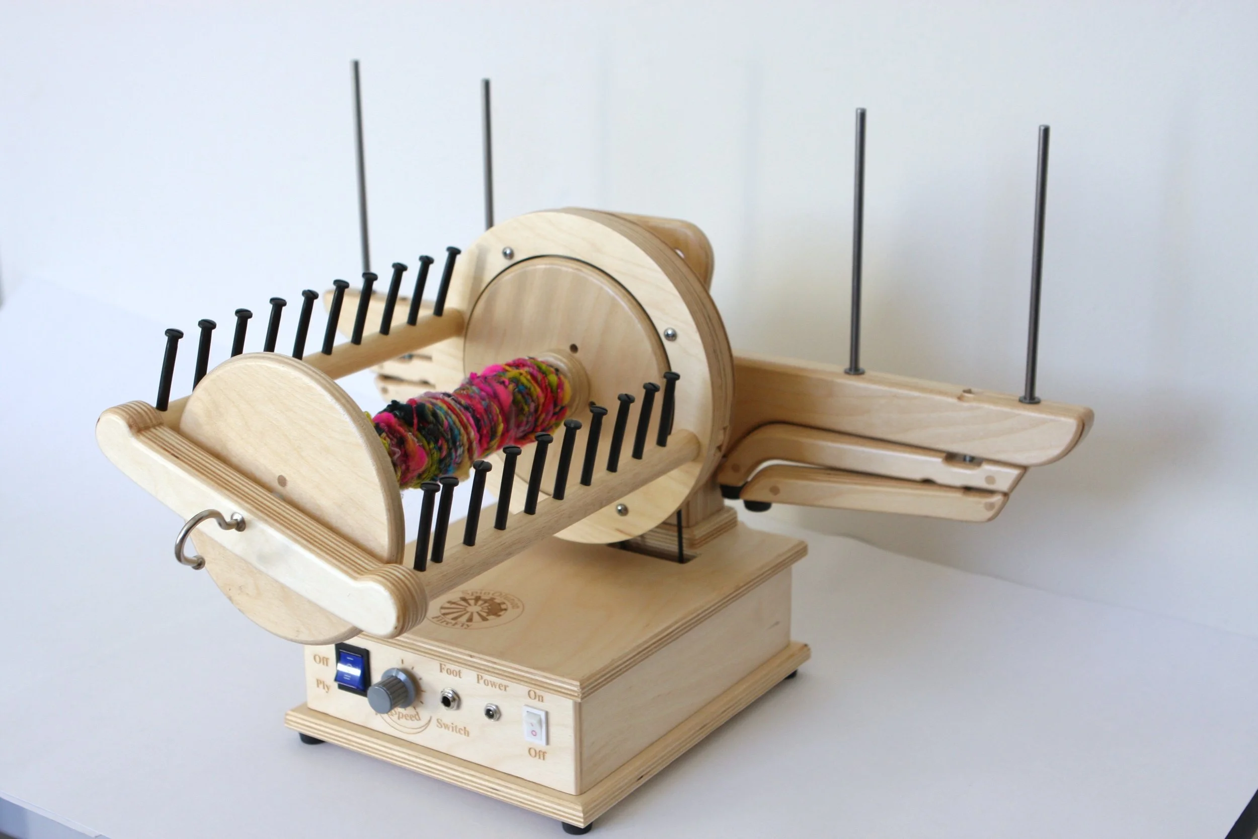 With adjustable legs and a small footprint, the Kate can be placed on the floor for easy plying with all SpinOlution wheels. For the smoothest plying when attached, bobbins or plying threads work best on the outermost rods, keeping tension even and controlled.
